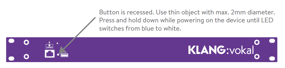 There is a detailed LED color sequence (DMI-KLANG, :vokal) during the update phase, to help troubleshoot. The color changes a first time when the button press is detected from blue to white, a next time when a USB drive was successfully detected from white to yellow and a third time when the update files were detected on the USB drive from yellow to cyan (light blue). During the update the LED flashes white with different speeds. On :kontroller and :konductor the progress is shown on the display.