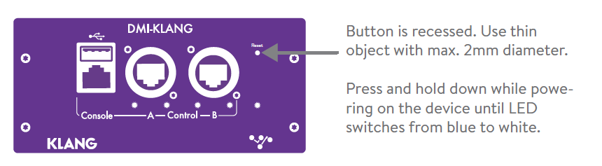 - Power on device WHILE pushing and holding the RESET/UPDATE button until Status LED switches from BLUE to WHITE (approx. 3 seconds)